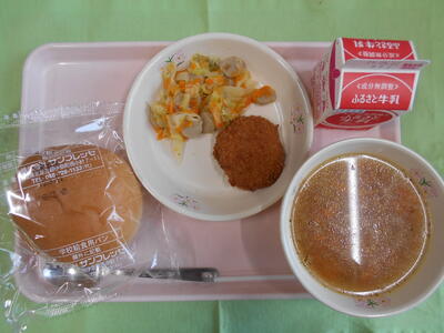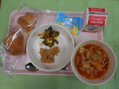 ツイストパン、牛乳、ミネストローネ、フライドチキン、三色ソテー、豆乳入りもちアイス