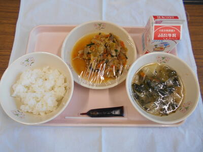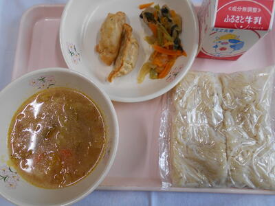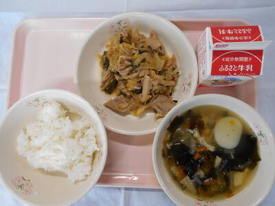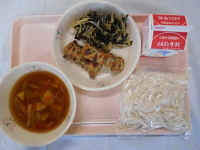 けんちんうどん 牛乳 ちくわの磯辺揚げ わかめとえのきの煮浸し