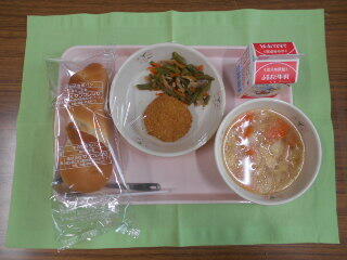 ツイストパン、牛乳、野菜スープ、メンチカツ、いんげんとベーコンのソテー