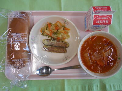 黒パン、牛乳、ミネストローネ、ウインナーの香味揚げ、キャベツソテー