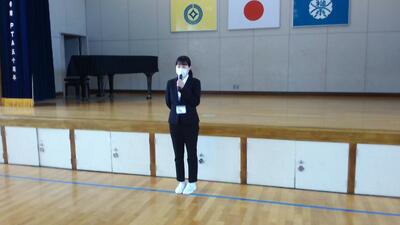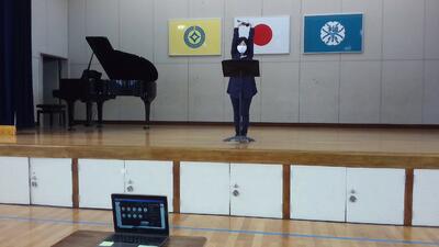 新型コロナウイルス対策のため、体育館と教室をパソコンでつなぎ、それぞれの学級で行いました。