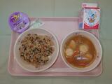 ごはん、牛乳、月見団子汁、和風おろしハンバーグ、ほうれん草とえのきの煮浸し