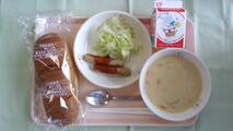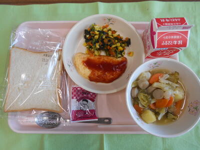 食パン、チョコレートクリーム、牛乳、ポトフ、オムレツケチャップソースかけ、三色ソテー