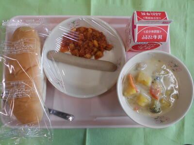コッペパン、牛乳、むさしのシチュー、フランクフルトソーセージ、チリコンカン
