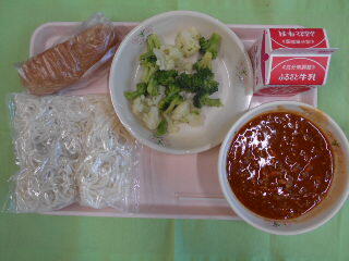 ミートソーススパゲティ、牛乳、きなこ揚げパン、花野菜のサラダ