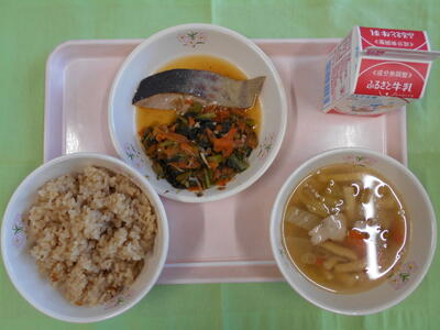 茶めし、牛乳、すいとん、さけの塩焼き、小松菜の煮浸し