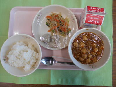 ごはん、牛乳、マーボー豆腐、しゅうまい、もやしのナムル