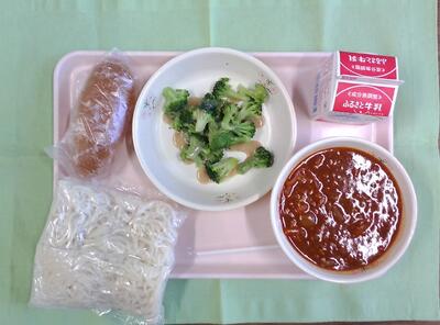 ミートソーススパゲティ、牛乳、さとう揚げパン、ブロッコリー