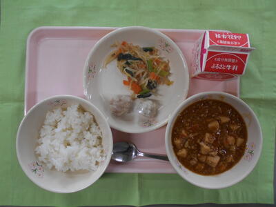 ごはん、牛乳、マーボー豆腐、しゅうまい、もやしのナムル