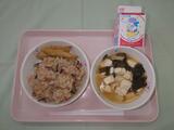 米粉入りシュガーパン、牛乳、白菜と肉団子のスープ、オムレツケチャップソースがけ、枝豆とマカロニのサラダ