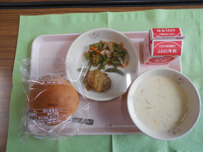 子供パン、牛乳、コーンポタージュ、鶏肉のカレー風味焼き、いんげんのソテー