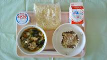 今日の献立は、学校給食が始まった当時をイメージした献立になっています。日本の学校給食は、明治22年、山形県鶴岡市にある私立忠愛小学校で始まりました。しかし、太平洋戦争が始まると物資不足から中断に追い込まれてしまいました。戦後の昭和21年12月24日、アメリカの支援団体からの支援物資により、学校給食が再開されました。そこで、学校給食が戦後再出発した意義を考え、冬休みと重ならない1月24日から30日までの一週間を「全国学校給食週間」としました。