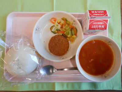 メロンパン、牛乳、ミネストローネ、ハムカツ、フレンチサラダ