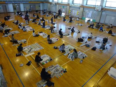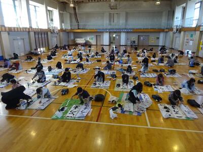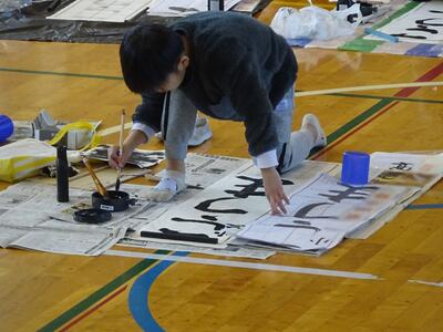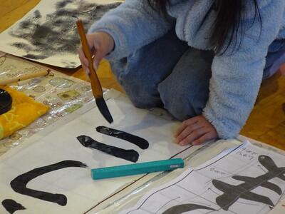普段使っている筆や用紙よりも大きいものを使うので、少し戸惑っている子もいました。